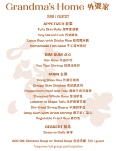 A family-style set menu at Grandma’s Home – $68 per person plus corkage (~$200), service, and tax split evenly among guests.